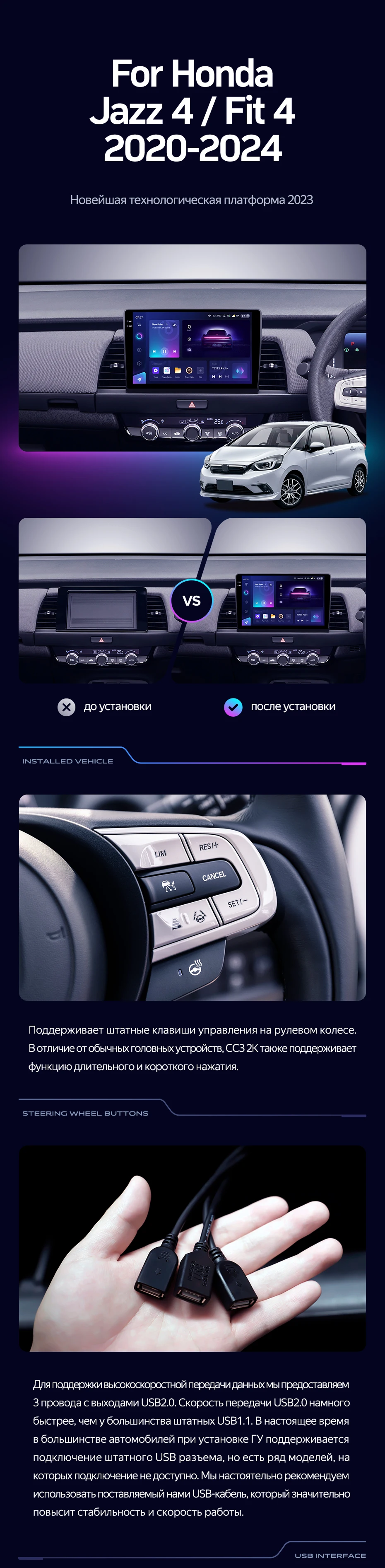 Готовый установочный комплект для магнитолы Honda Jazz 4 / Fit 4 GR GS (2020-2024) Тип-A Правый руль 10 дюймов в штатное место, включает переходную рамку и проводку.