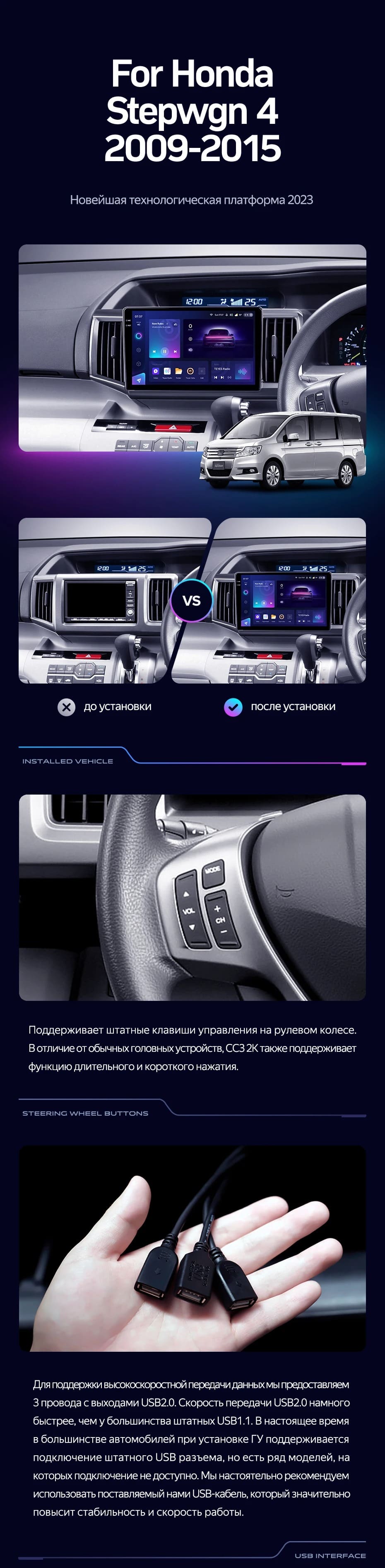 Готовый установочный комплект для магнитолы Honda Stepwgn 4 (2009-2015) Правый руль 10 дюймов в штатное место, включает переходную рамку и проводку.