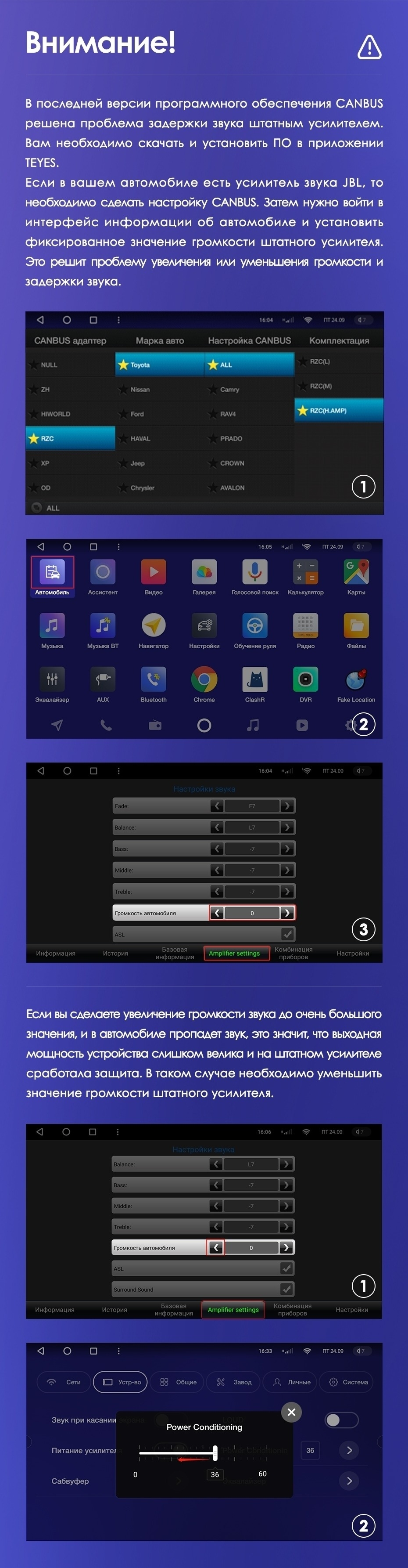 Производитель использует только современные технологические и программные решения, что не заставляет ждать результатов. Новинка компании получила объемный звук с широкими возможностями настройки. Любые помехи или задержки в работе магнитолы исключены. Звуковой чип DPS Adau1701 в сочетании с Rohman32107, подключение посредством оптоволоконного кабеля цифровых выходов — все направлено на превосходный звук.