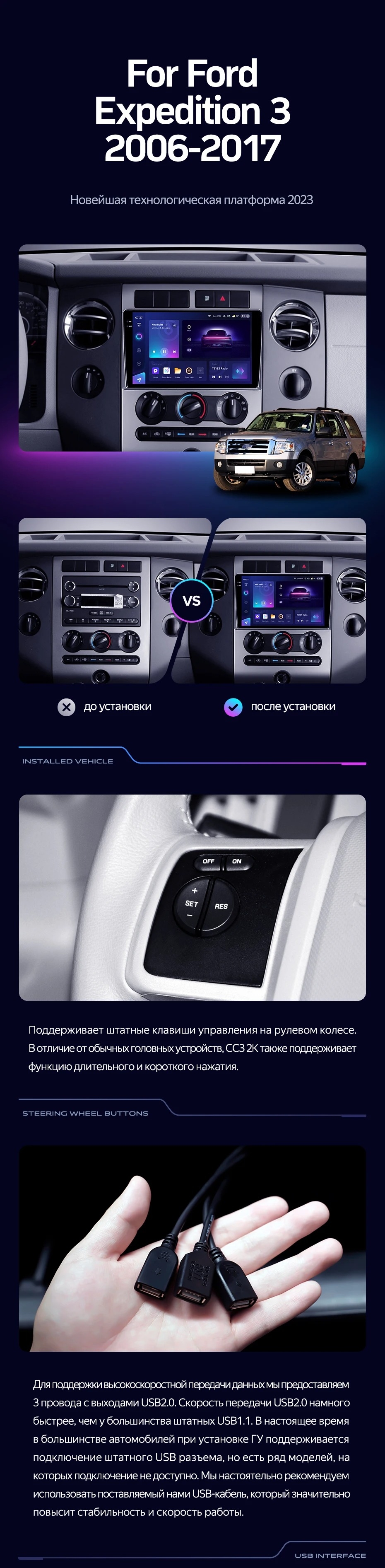 Полный комплект установки магнитолы Teyes с рамкой и проводкой можно выбрать в каталоге штатных магнитол Ford Expedition 3 U3242 U3542 U324 U354 (2006-2017).