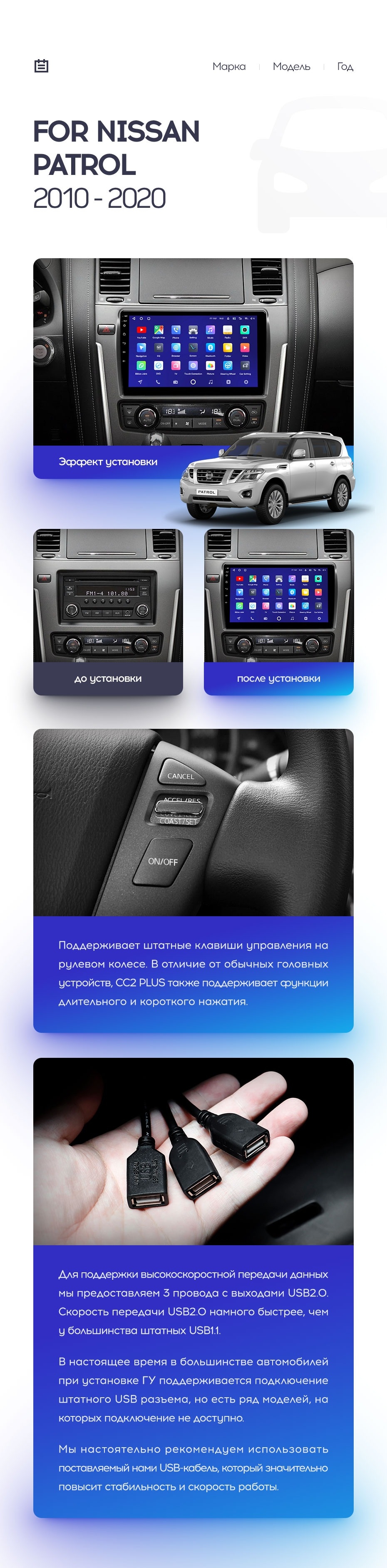 Полный комплект установки магнитолы Teyes с рамкой и проводкой можно выбрать в каталоге штатных магнитол Nissan Patrol Y62 (2010-2020).